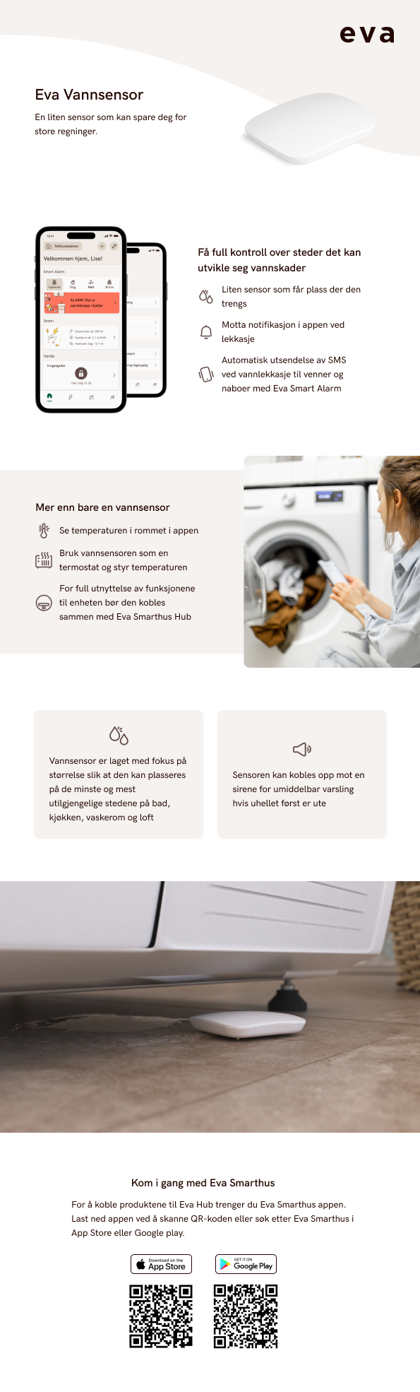 - Gå i Eva Smarthus app og trykk på "Legg til ny enhet" og velg "Eva Vannsensor". Skann QR-koden på vannsensoren og følg videre veiledning i app.